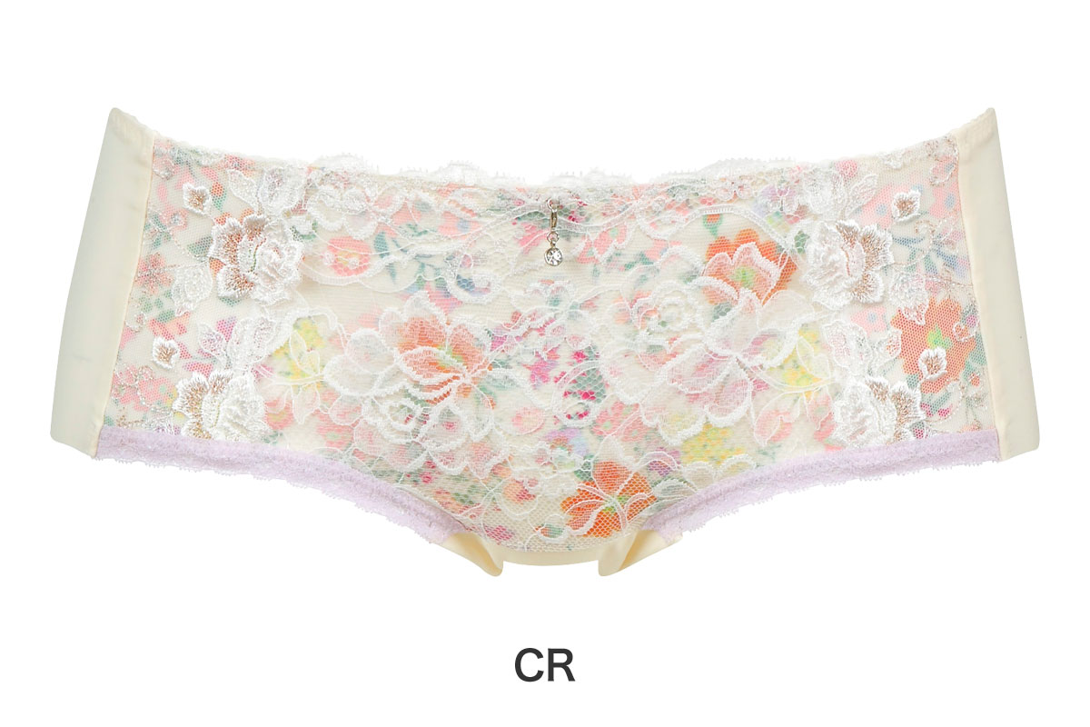 ・フロントは、贅沢にリバーレースと切替エンブチュールレースをあしらい、プリントの透け感とラメ糸の煌めきが華やかなデザイン。