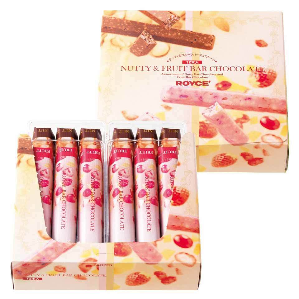 奥深い味わいのチョコレートと香ばしいナッツのハーモニーがたまらないナッティバーチョコレートと、フルーツの風味とチョコレートのおいしさがとけ合うフルーツバーチョコレートを6本ずつ詰め合わせました。
