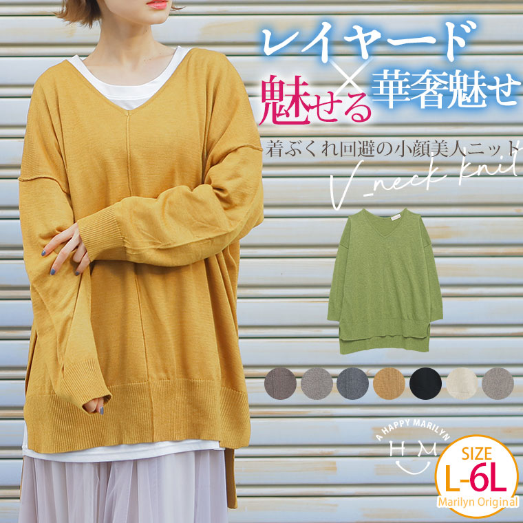 大きいサイズ レディース トップス | ゆるっと華奢魅せ 着ぶくれ回避の アウトリンキング Vネック 華奢魅せ ニット _ オリジナル プルオーバー LL 3L 4L 5L 6L 春 春物 春服 ぽっちゃり ゆったり お腹 胸周り 腰周り 長袖 かわいい おしゃれ [481032] OMMTO